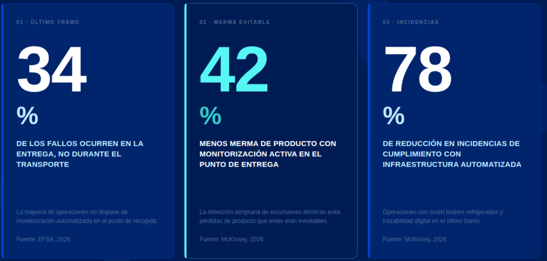 ¿Dónde se producen realmente la mayoría de los fallos en la cadena de frío?Según datos de la EFSA de 2026, aproximadamente el 34% de los fallos en la cadena de frío se producen en la etapa de entrega y recogida de última milla — no durante el transporte. Esta es la brecha de mayor riesgo de incumplimiento y la menos cubierta con infraestructura de monitorización automatizada.